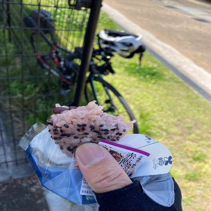 焼き鮭とお赤飯のおにぎりで塩分も多めに摂取、もち米多めでお腹のもちもいい感じ。 いつもはゼリーやクッキー状の補給食を持っていくのだけれど、今回は新商品。「ナッツ」を持ってライド。
