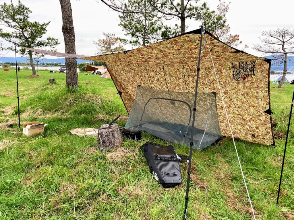 自転車でソロキャンプに行くようになってから1年、装備も色々と変わりました。どの季節もキャンプは楽しいものです。テント泊、ハンモック泊、そして今回はタープの下に蚊帳を吊りお座敷スタイルで過ごしてきました。